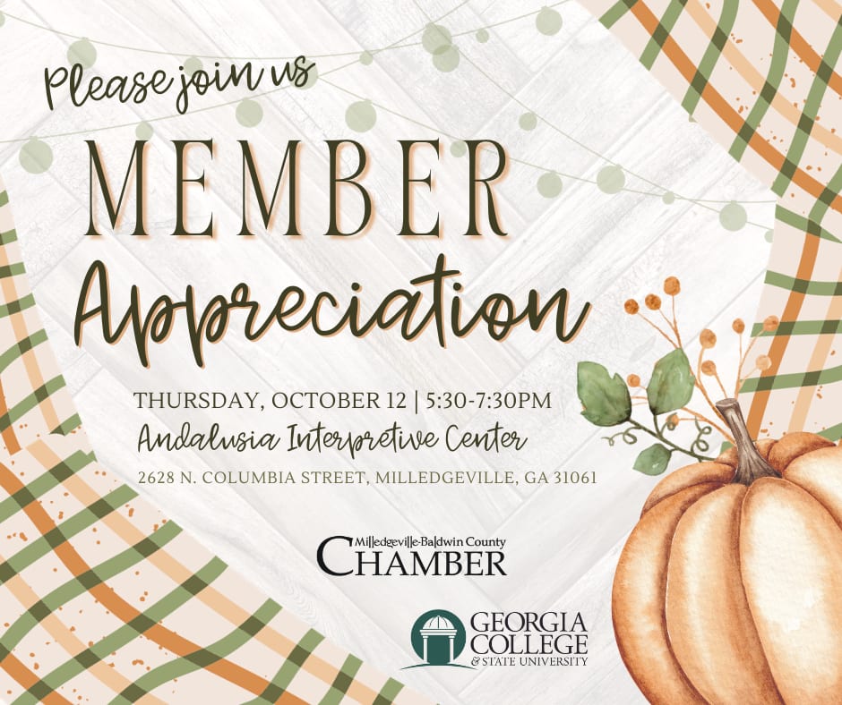 Come and celebrate with us on Thursday, October 12 as we honor and celebrate, you, our valued Chamber members! This year's event promises to be unforgettable as we gather at the new Andalusia Interpretive Center. A huge thank you goes out to Georgia College & State University for graciously hosting and sponsoring our Member Appreciation. You won't want to miss this! This event is FREE to all members!