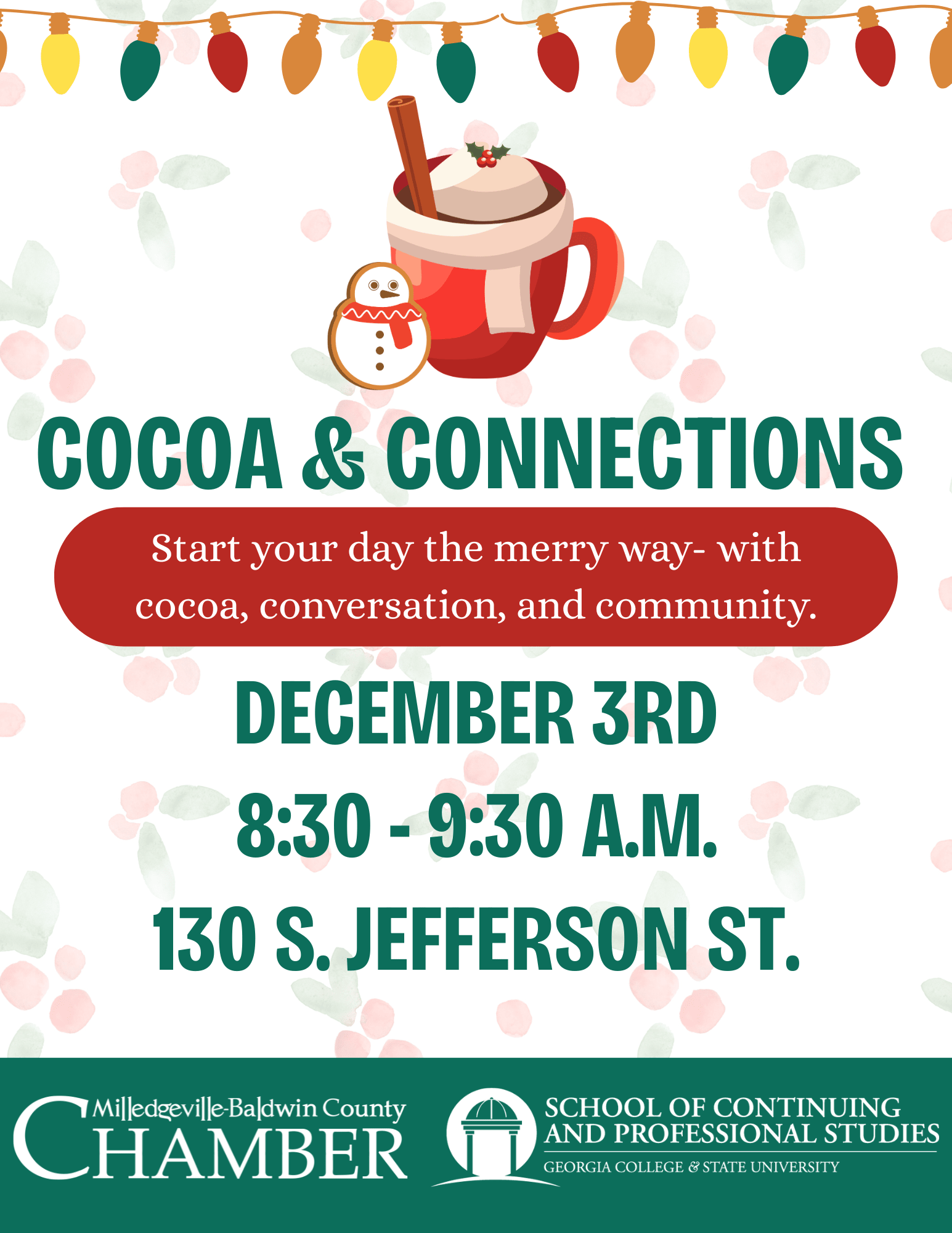 🎄☕ Introducing Cocoa & Connections! Start your day the merry way — with cocoa, conversation, and community! ✨ Join the Chamber and Georgia College’s School of Continuing & Professional Studies for our first-ever Cocoa & Connections on Tuesday, December 3rd from 8:30–9:30 AM at 130 S. Jefferson St. This festive morning mixer will feature fun networking activities like: 🎁 Two Truths & A Wish – Share two truths about your business year and one wish for 2026. 🎅 Secret Elf Networking – Help a fellow business owner with a challenge or make a valuable connection. 🧠 Holiday Trivia – Play for prizes and a little friendly fun! Come ready to connect, collaborate, and celebrate the season with your Chamber community!